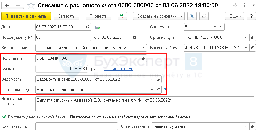 - Сумма — сумма отпускных перечисленная банку, согласно выписке банка.