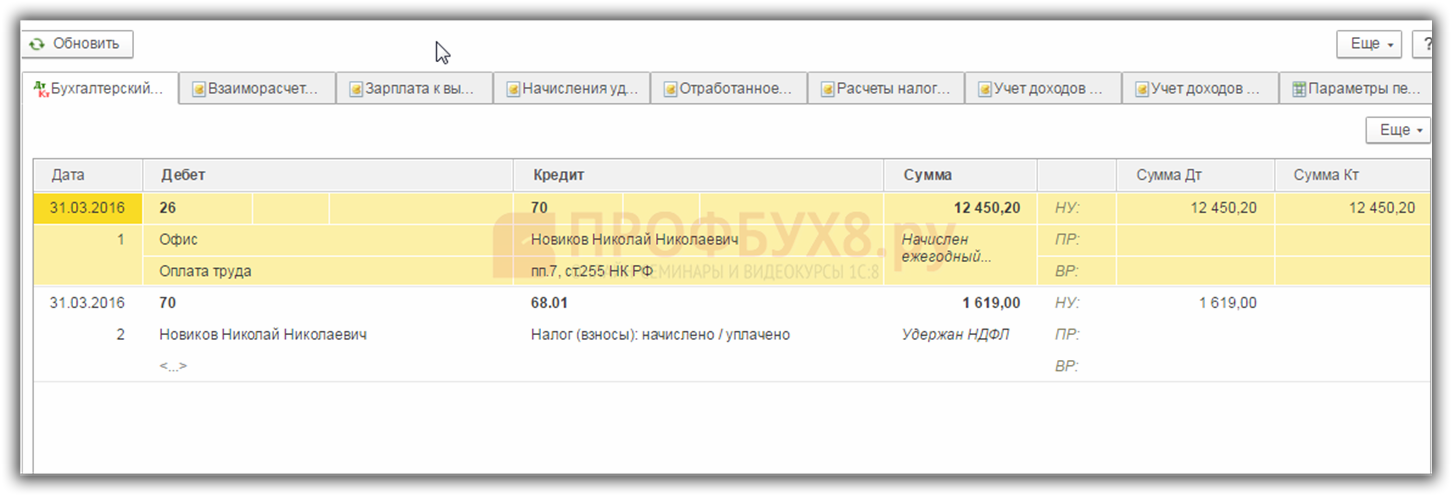 | 3 | 70 | 68 | 1 242,31 рубля | Удержан НДФЛ с отпускных | Ведомость по начислению заработной платы |