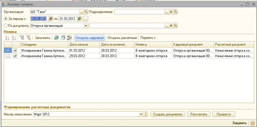 В некоторых случаях нельзя полностью автоматизировать обработку. Например, в нашем примере с двумя дополнительными отпусками. В расчетном документе Начисление отпуска сотрудникам организаций