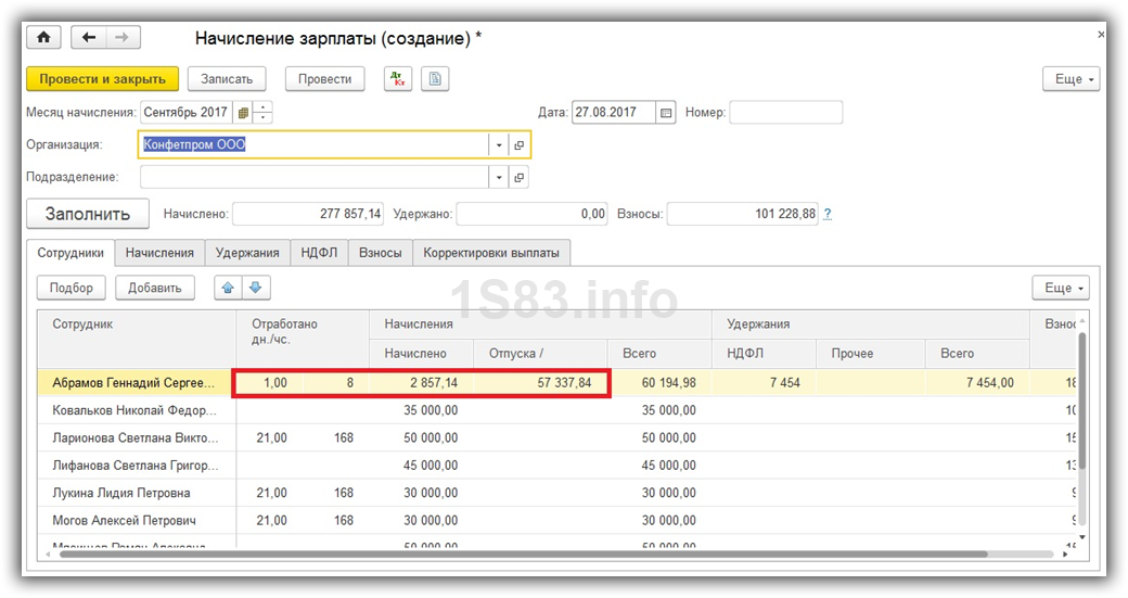 Создадим документ начисления зарплаты, который расположен в том же разделе, что и отпуска. В шапке укажем, что начисление мы будем производить за сентябрь 2017 года для организации «Конфетпром ООО».