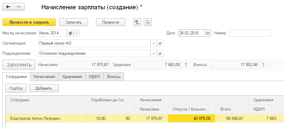 После нажатия на кнопку «Заполнить» программа автоматически рассчитает начисления по всем сотрудникам указанной организации с учетом отработанного времени. Мы видим, что у сотрудника, для которого мы только что оформили отпуск, заработная плата рассчиталась всего за один день. Дело в том, что практически весь месяц он находится в отпуске и программа это учла. Остальная сумма начислений отобразилась в колонке «Отпуска».