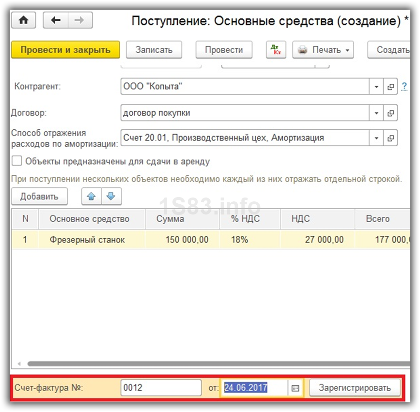 Далее зарегистрируйте счет-фактуру внизу формы документа, указав ее номер и дату.
