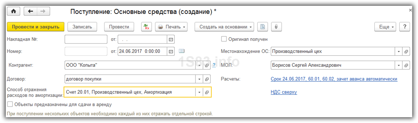 В открывшемся окне нажмите на кнопку «Создать». В его шапке укажите контрагента, который поставляет нас данный станок, и выберите договор. Если данный объект предназначен для сдачи в аренду, отметьте это.