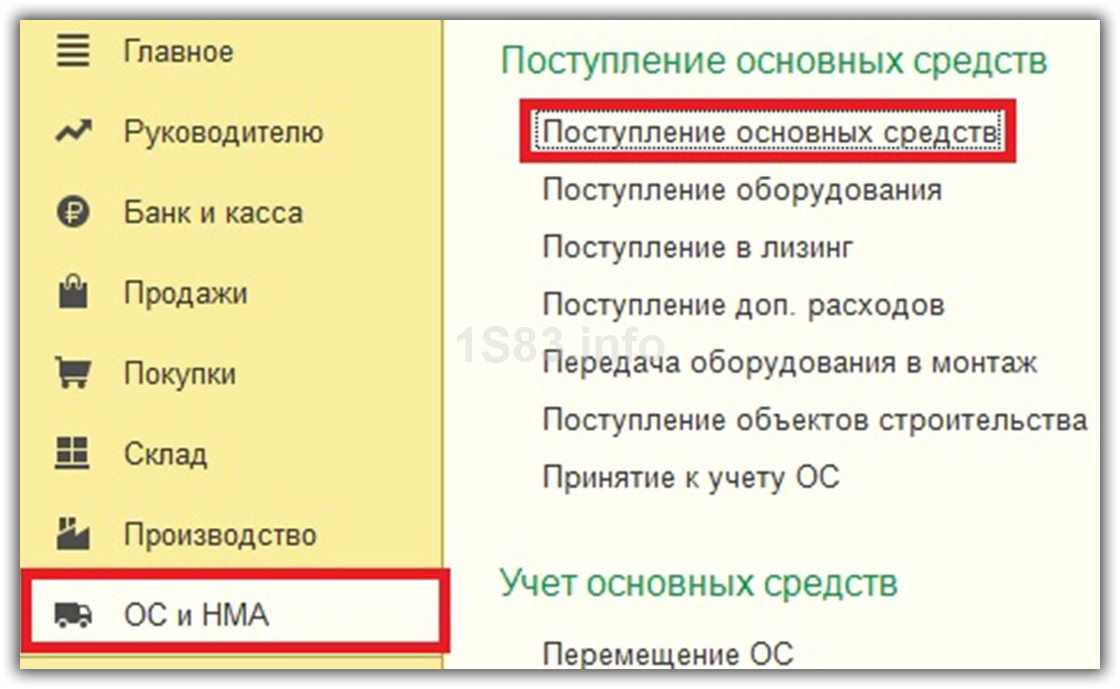 В разделе «ОС и НМА» нажмите на ссылку «Поступление основных средств».