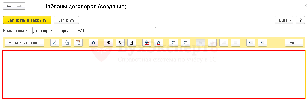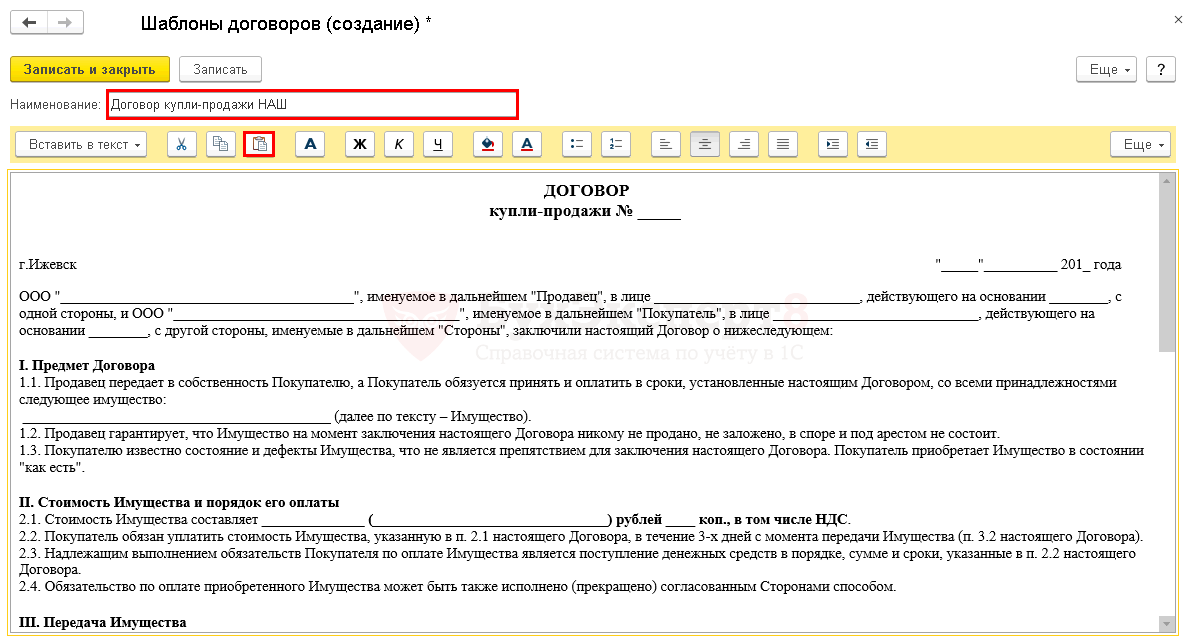 Шаг 3. Выделить текст в файле Word и вставить его по кнопке Вставить текстового редактора (Ctrl+V). Указать в поле Наименование название шаблона Договор купли-продажи НАШ.