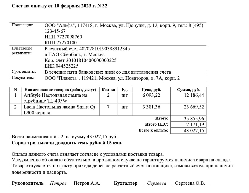 - На счете отсутствуют подписи ответственных лиц, проставлен оттиск печати. Это необходимо, чтобы документ стал юридически значимым.