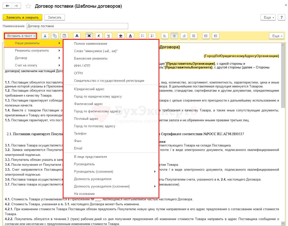 Дополнительные реквизиты для вставки в текст доступны по кнопке Вставить в текст карточки Шаблона договора. Могут быть вставлены дополнительно: