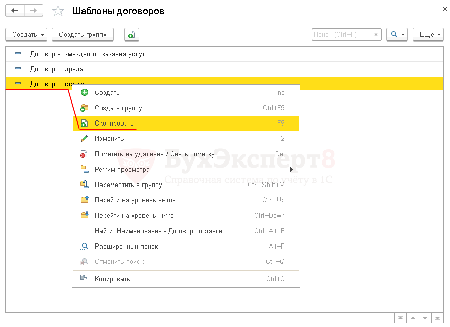 Новый шаблон создается на основе типового шаблона договора 1С по кнопке F9 или по команде правой кнопки мыши Скопировать.