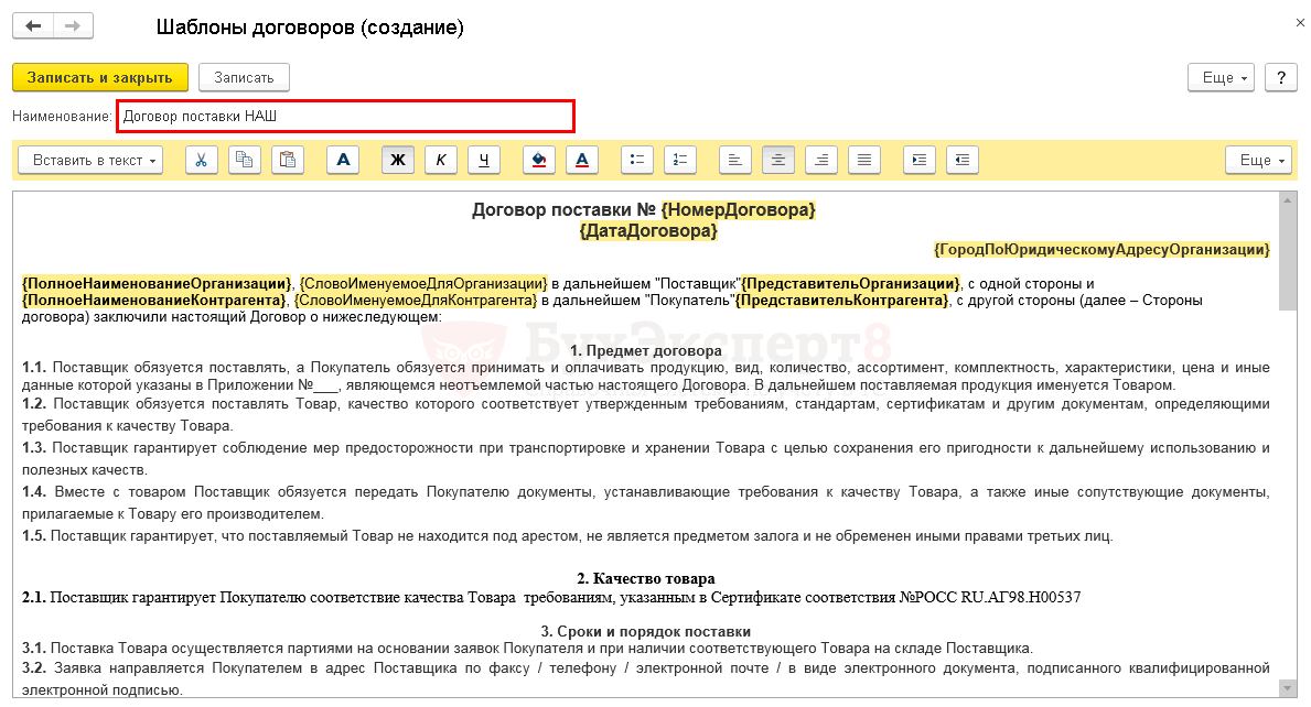 В созданной копии типового шаблона указывается новое наименование Шаблона договора, например, Договор поставки НАШ и корректируется текст договора, как было рассмотрено в теме Изменение шаблона договора.