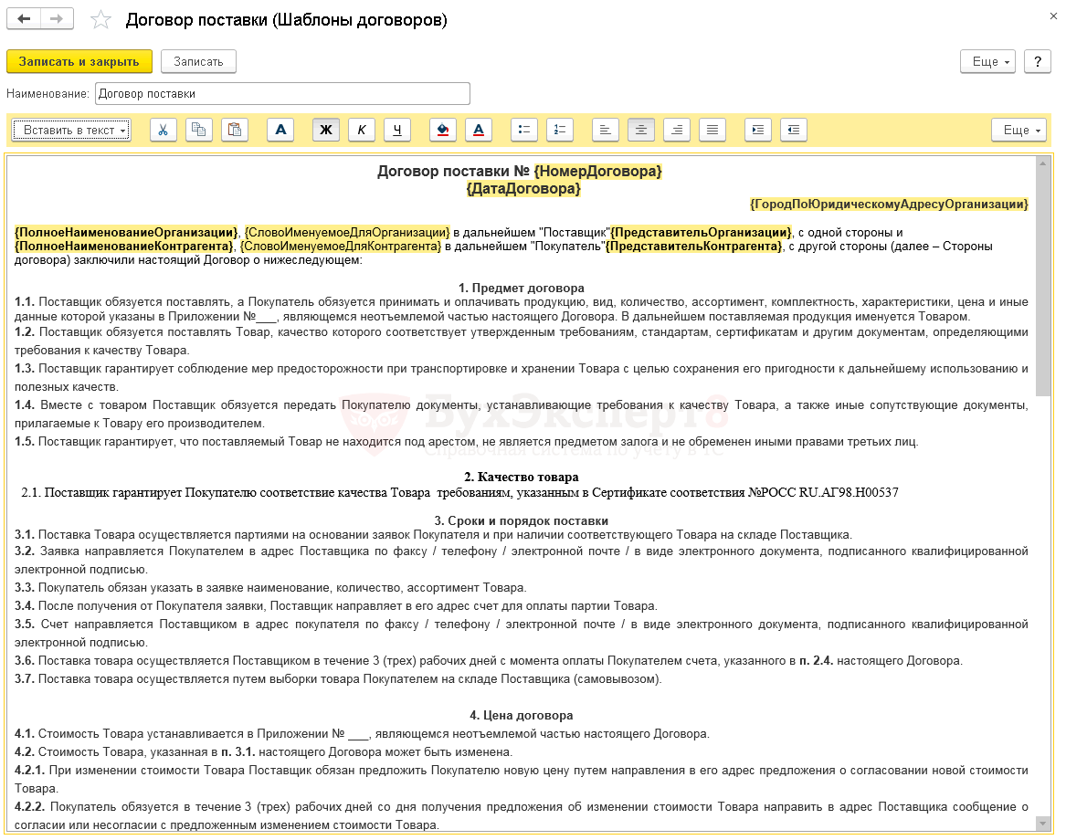 В 1С для создания и редактирования текста шаблонов договора используется специальный конструктор шаблона договоров, позволяющий вставлять в текст договора дополнительные данные, указанные в карточке организации и контрагента, информацию из карточки самого договора.