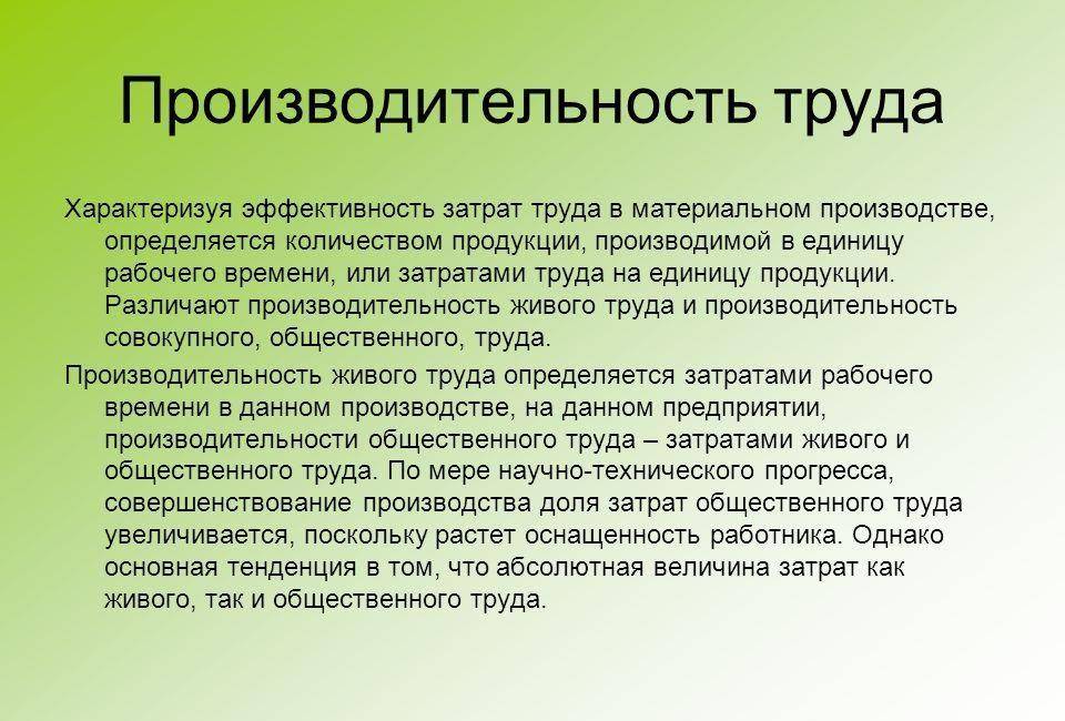 Производительность труда — важнейший экономический показатель, служащий для определения результативности (продуктивности) трудовой деятельности как отдельного работника, так и коллектива предприятия.