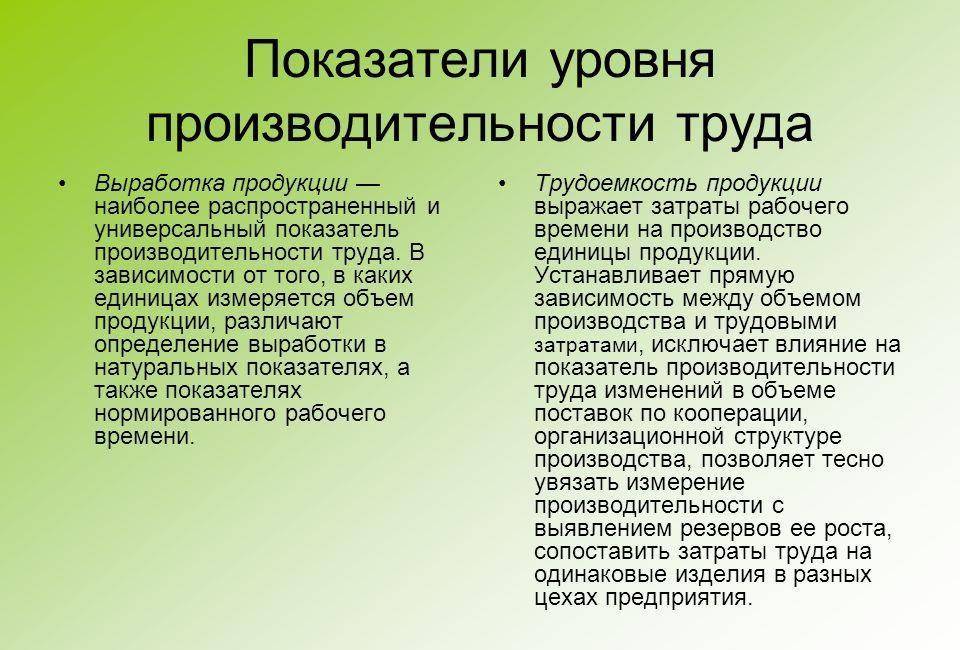 Уровень производительности труда характеризуется такими принципами, как выработка и трудоёмкость.
