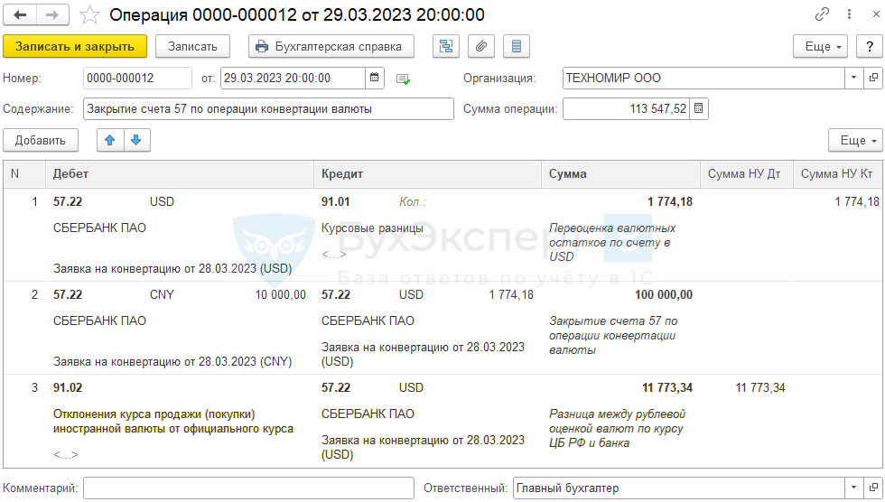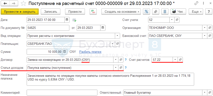 - Д-т 57/Конверсия – К-т 52 – 431 677,73 руб. (5968,50 долл. х 72,3260) – списаны доллары для обмена на евро; в этом случае, как и при продаже валюты, проводки используют транзитный счет 57, но с отдельным субсчетом для конверсионных операций;