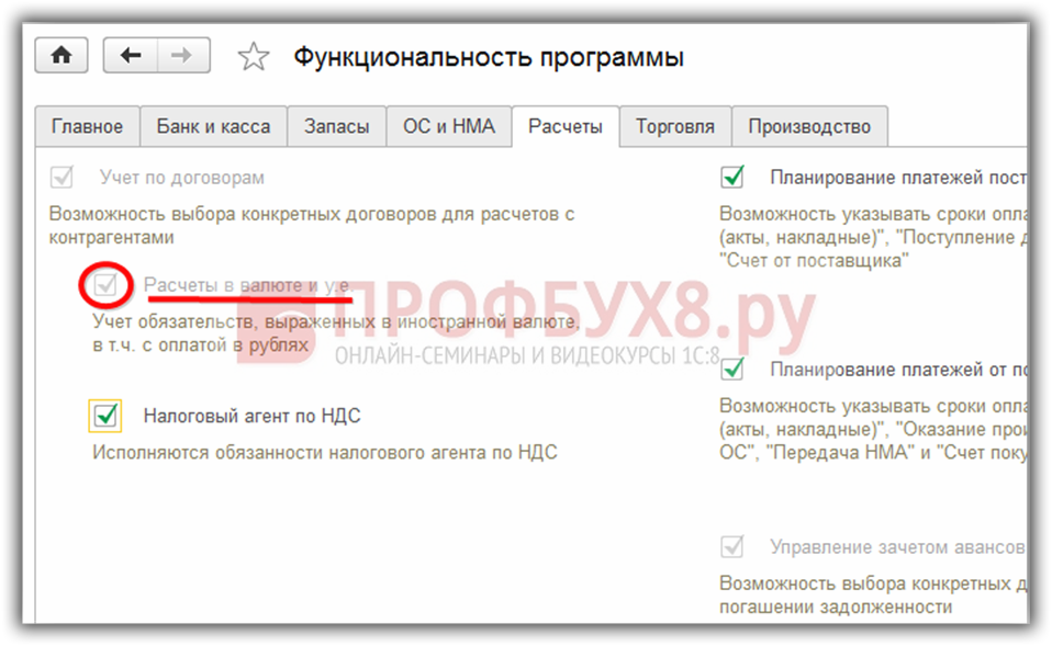 Кроме того, убедимся, что в Бухгалтерии предприятия 1С 8.3 установлена возможность ведения валютных расчётов. Для нашего релиза конфигурации 1С Бухгалтерии 8.3 соответствующий флаг «Расчеты в валюте и у.е.» расположен на вкладке Расчеты. Не исключено, что в Вашей версии конфигурации настройка может находиться на другой вкладке, её следует найти в форме «Функциональность программы»:
