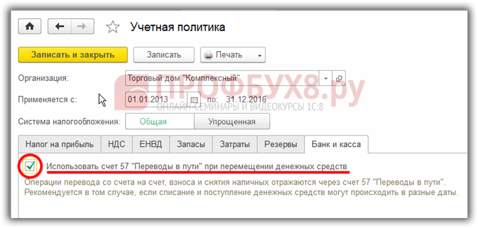 Далее на вкладке Банк и касса формы учетной политики надо возвести в активное состояние (если это не было сделано) флаг «Использовать счет 57 «Переводы в пути» при перемещении денежных средств»: