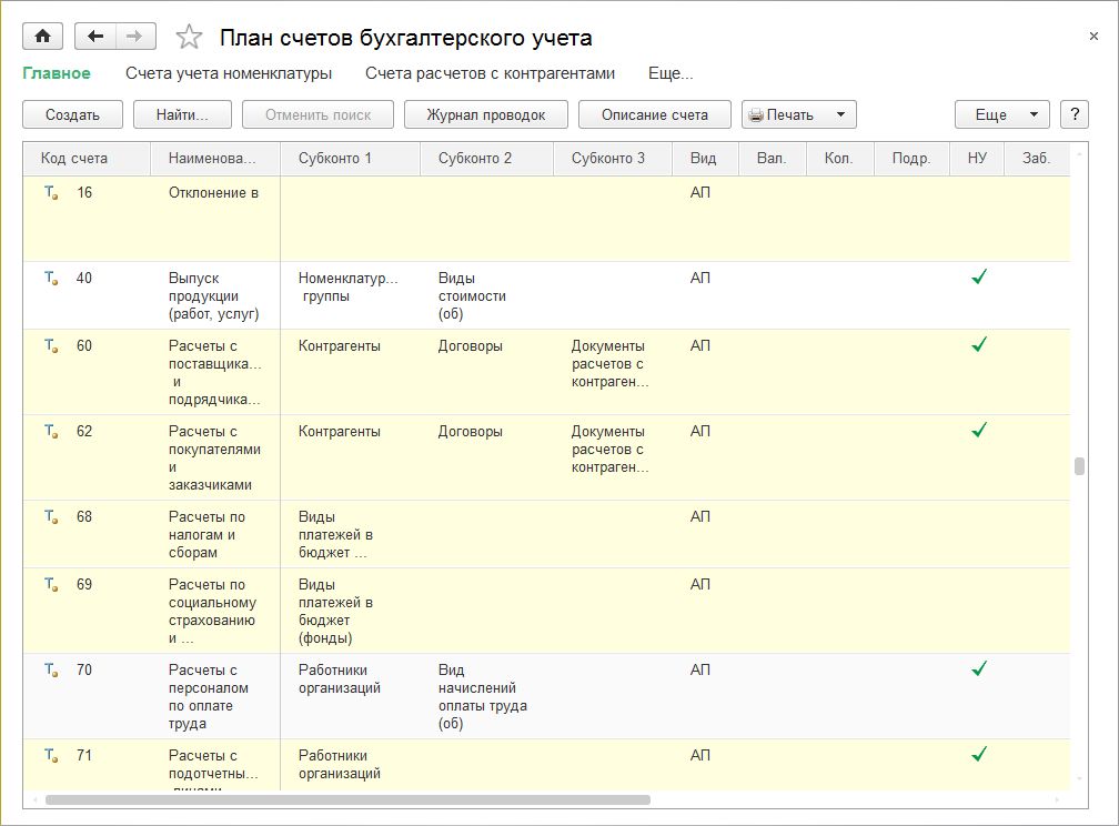 К активно-пассивным счетам (в колонке Вид указан признак АП) относятся следующие счета (рис. 4):