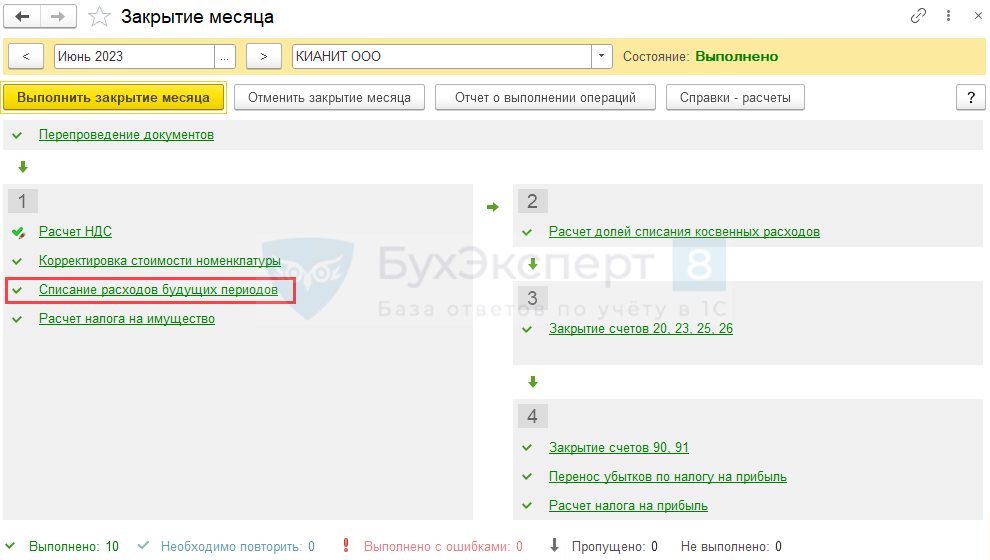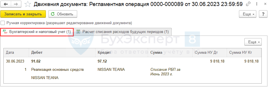 Ежемесячно до тех пор, пока убыток не будет списан в полном объеме, в меню процедуры Закрытие месяца регламентная операция Списание расходов будущих периодов.
