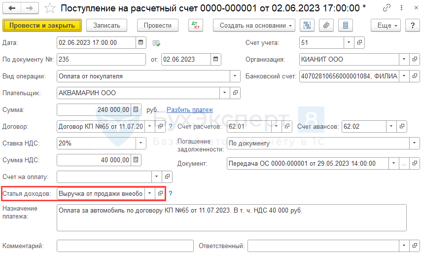 - Статья доходов — статья движения денежных средств. В нашем примере реализуются ОС, поэтому Статья доходов указывается с Видом движения — Выручка от продажи внеоборотных активов (кроме финансовых вложений).