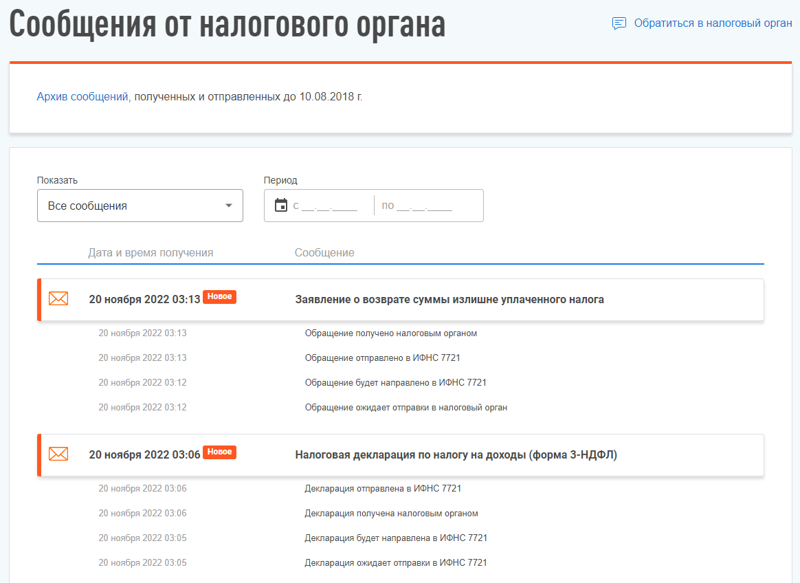 Статус рассмотрения обращения мониторится в личном кабинете на сайте ФНС