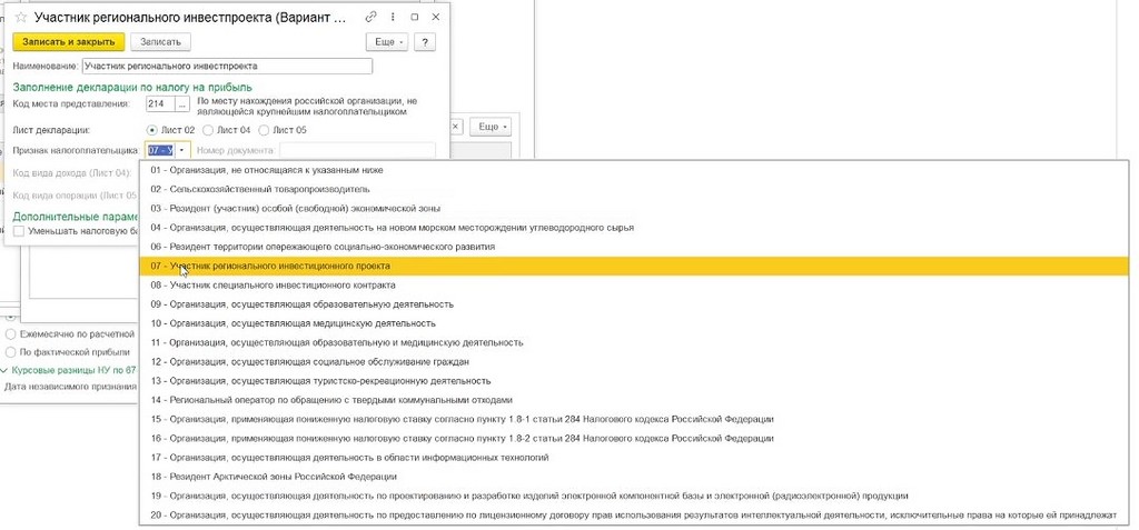 Соответственно, признак налогоплательщика 07 – участник регионального инвестпроекта. В списке перечислены ситуации, когда в организации может быть раздельный учет по налогу на прибыль и которые предусмотрены в декларации.