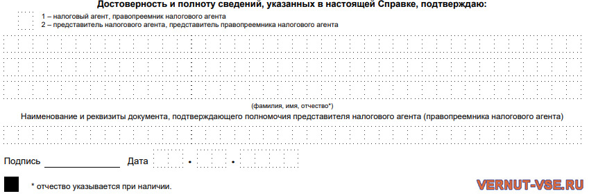 В конце формы указывается полное ФИО налогового агента (представителя) и подпись. Печать организации проставлять в новой справке необязательно.