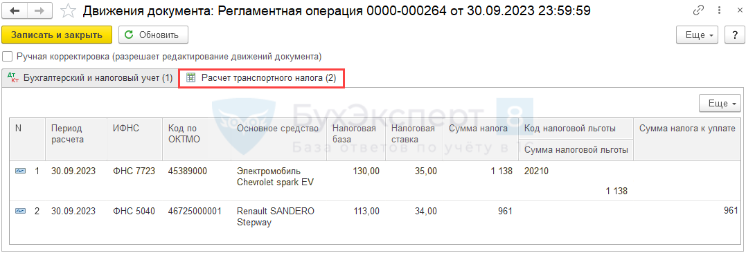 После выполнения операции в регистр Расчет транспортного налога записываются данные по исчислению авансового платежа за отчетный период.