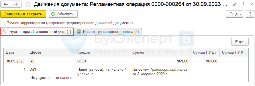 Формируется проводка в соответствии установленным в настройках транспортного налога Способом отражения в расходах ( Главное — Налоги и отчеты — Транспортный налог — ссылка Способы отражения расходов ).