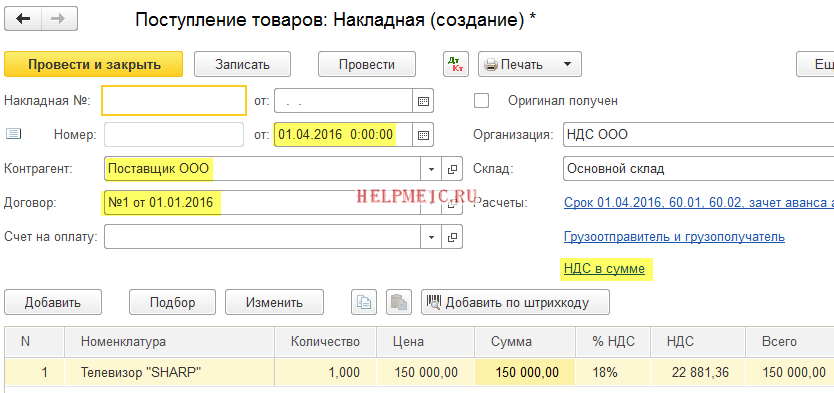 Заносим в программу поступление товара от ООО «Поставщик» 01.04.2016 на сумму 150 000 рублей (включая НДС):