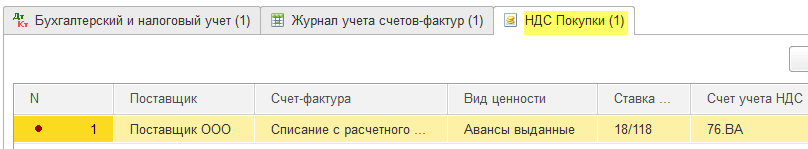 - Запись (со знаком +, приход) в этот регистр накапливает наш «входящий» НДС (аналогично записи в дебет 19 счета).