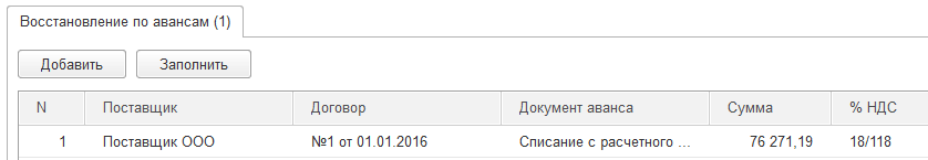 В открывшемся документе переходим на закладку «Восстановление по авансам» и нажимаем кнопку «Заполнить»: